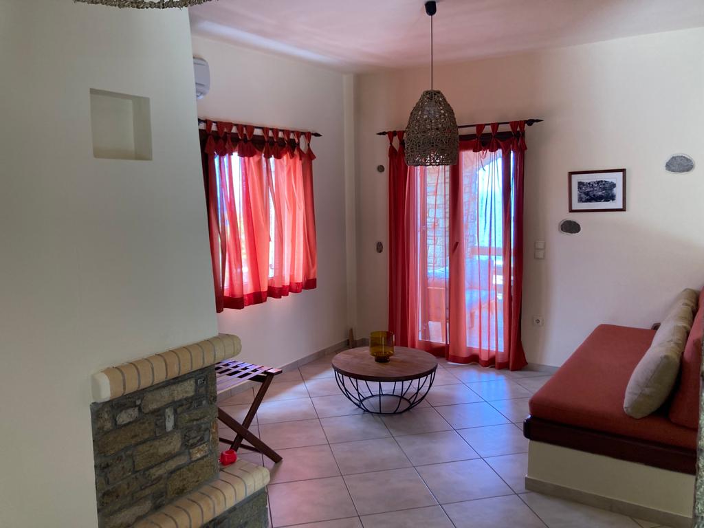 EG: Wohnzimmer mit Kamin, Veranda 15 m² mit Blick auf das Meer, Klimaanlage, komplett ausgestattete Kuche, Bad und LCD-TV mit Satellitenanschluss.