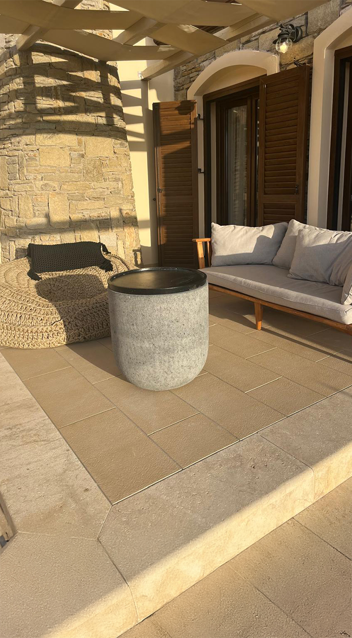 Στον εξωτερικό χώρο της σουίτας, η βεράντα με την υπέροχη θέα ακριβώς πάνω από τη θάλασσα, στην οποία υπάρχει ιδιωτική πισίνα θαλασσινού νερού, ξαπλώστρες, τραπεζαρία, και μια μαγική κούνια για ώρες χαλάρωσης.